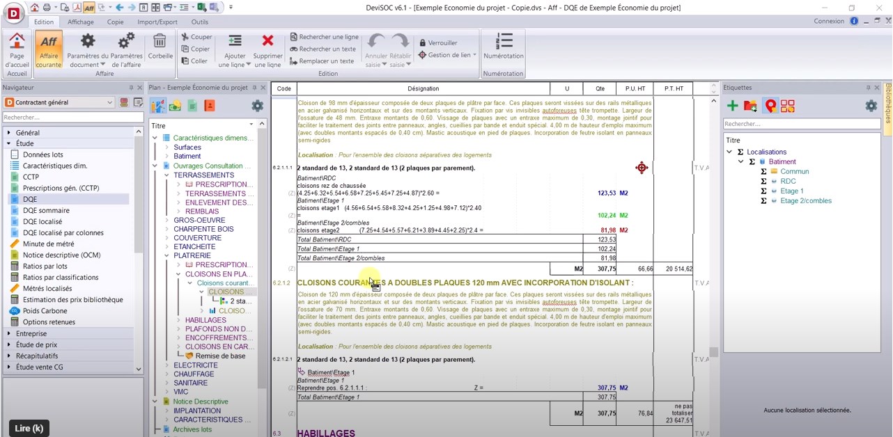 Une fois les étiquettes appliquées, DeviSOC permet de générer un récapitulatif détaillé par secteur ou par zone géographique. Vous pouvez ainsi visualiser clairement les coûts et les métrés pour chaque partie du projet.