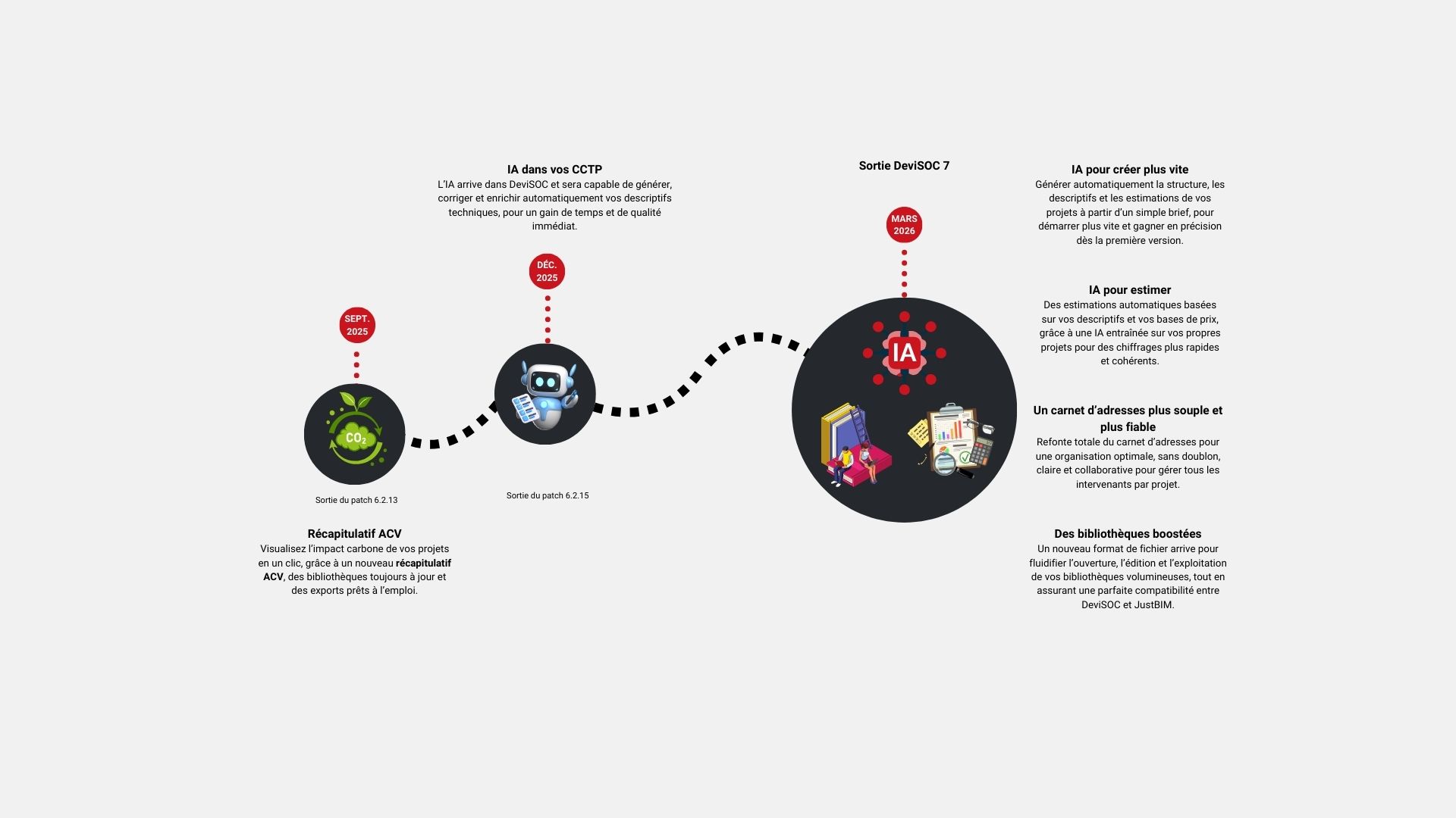 C’est dans cette logique que nous vous dévoilons aujourd’hui nos prochaines étapes pour DeviSOC et JustBIM, regroupées dans deux roadmaps claires, transparentes et résolument tournées vers la performance utilisateur.